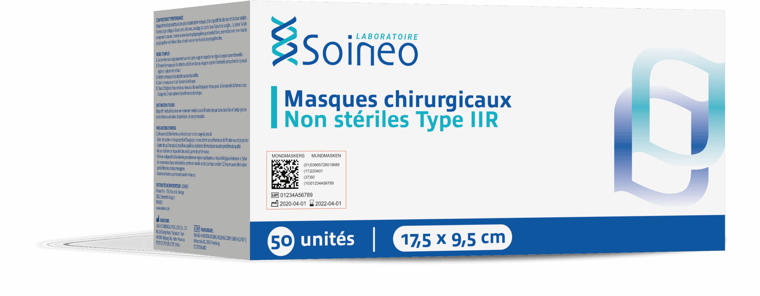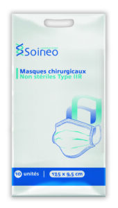 Dispositif médical et équipement de protection individuelle constitué de polypropylène spunbonded blanc en interne, intermédiaire en non tissé de polypropylène melt-blown blanc, et extérieure en non tissé de polypropylène bleu (masque chirurgical) ou blanc (EPI).