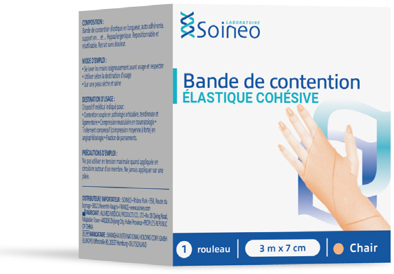 Les bandes de contention sont conformes au référentiel technique élaboré par l’Association pour la Promotion de l’Assurance Qualité dans la filière textile habillement (ASQUAL). Les bandes adhésives élastiques, en coton, sont conçues pour faire de vrais strapings.